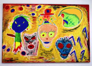 Auf orange gelben Hintergrund sind sechs erschreckende, zum Teil totenkopfartige, vernarbte Gesichter von Monstern mit entsetzt oder finster blickenden, verschieden farbigen Augen dargestellt. Die Szene ist von rot umsäumt. Links unten befinden sich fünf blaue Sicheln mit denen der Tod das Leben niedermäht. Rechts oben und rechts unten sind rote Sonnen und blaue Sonnenfinsternisse dargestellt. Das Bild gewinnt einen räumlichen Eindruck durch seine teilweise nur angedeutete braunschwarze Schattierung.